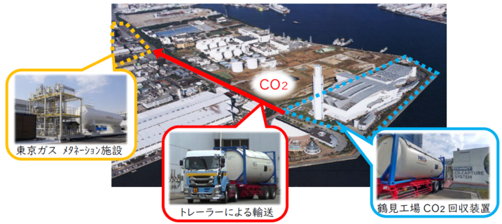 横浜市、東京ガス株式会社、三菱重工業株式会社、三菱重工環境・化学エンジニアリング株式会社は、横浜市鶴見区末広町において、ごみ焼却工場の排ガスから分離・回収したCO2を東京ガスのメタネーション実証設備に輸送し、メタネーションの原料として利用する、国内初となる地域連携でのCCU共同実証を行っています。