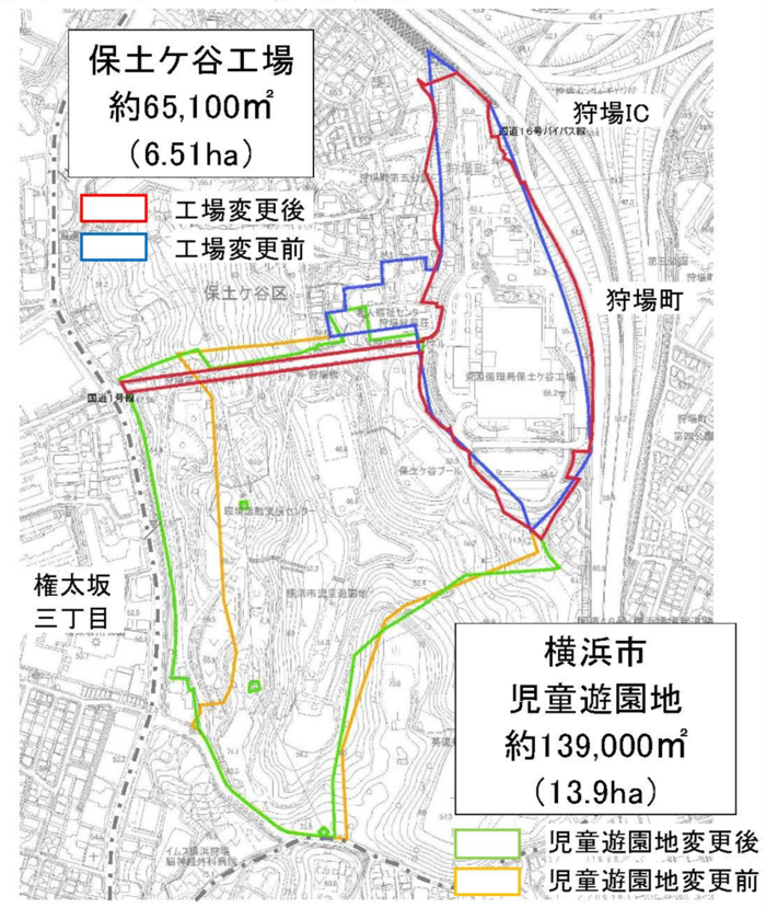 ※保土ケ谷工場の都市計画区域の変更に伴い、隣接する児童遊園地の都市計画区域についても変更が生じるため、児童遊園地の都市計画変更区域図とあわせて記載しています。