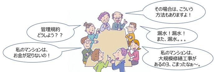 - 横浜市では、参加者同士で、マンションでの困り事を話しあい、「どのように解決したらよいか」を考える交流会を設けています。(マンション管理組合交流会)