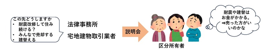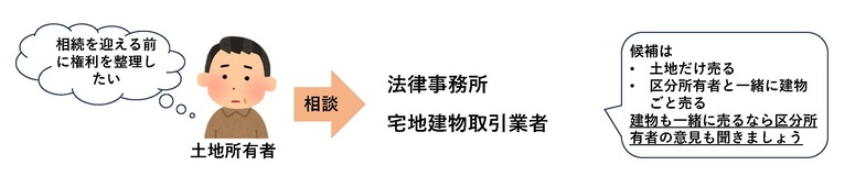 土地所有者の依頼を受け、法律事務所と宅地建物取引業者は区分所有者と今後について話し合いを始めました。