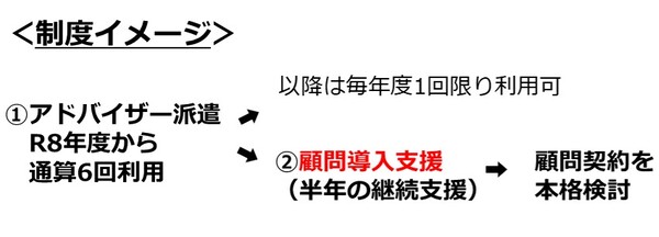 令和8年度から、アドバイザー派遣のその先の支援として、派遣専門家による顧問を試行的に体験できる「顧問導入支援制度」を新設しました。