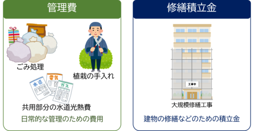 管理費は清掃・ごみ処理・植栽の手入れなどのほか、共用部分の水道光熱費や火災・損害保険料など 日常的な管理のための費用であるのに対し、修繕積立金は大規模修繕工事などの建物の修繕などのための積立金です。