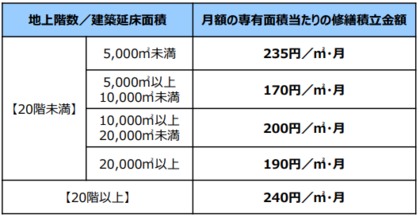 修繕積立金の額の目安の水準(下限値・機械式駐車場分がある場合は別の金額となります。)