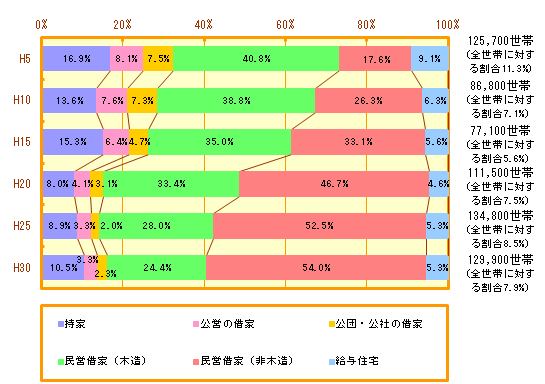 内訳をみると、非木造の民営借家が占める割合が5割を超えており、最低居住面積水準未満の住宅に占める割合が増加していることが分かります(図3-5-1)。