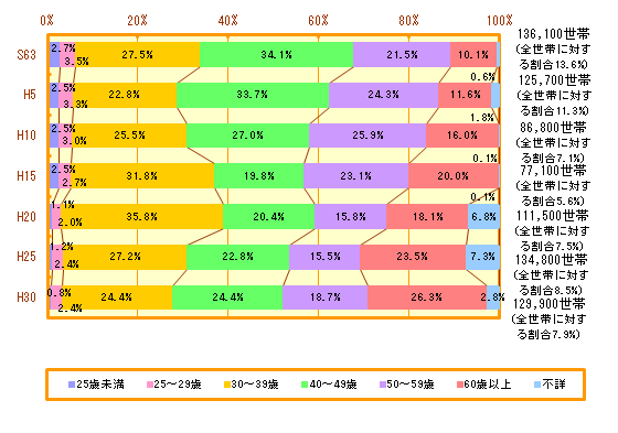 最低居住面積水準未満の住宅に居住する世帯を、世帯主の年齢別にみると、30代・40代の割合が高く、近年では60歳以上の割合が高くなってきています。(図3-5-3)。