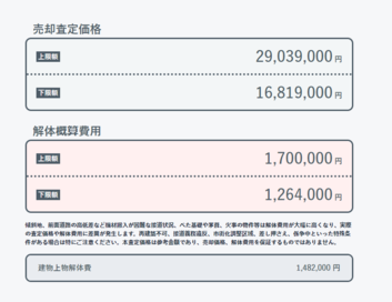 土地建物の面積や最寄り駅、接する道の幅についての質問に答えると、「建物の解体費用」や、解体後の「土地の売却価格」の概算額を把握することができます。利用は無料です。