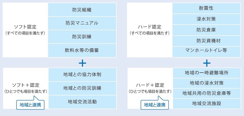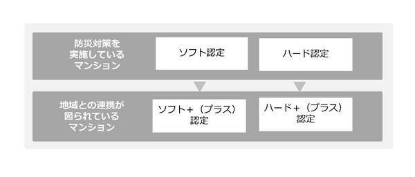 防災対策を実施しているマンションのうち、防災活動などのソフト対策を実施しているマンションを「ソフト認定」、建物全体の対策を実施しているマンションを「ハード認定」としてそれぞれ認定します。地域との連携が図られているマンションは更にそれぞれ「ソフト+(プラス)認定」「ハード+(プラス)認定」として認定します。