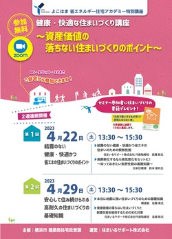 | 5月19日 | 「脱炭素社会に求められる住宅性能とは?横浜市にマッチした健康・省エネ住宅のつくり方~母胎にやさしい住環境 長持ちする家づくり(防腐・防蟻編)~」(PDF:1,543KB) | ハイブリッド(会場対面形式+WEB形式)セミナー | - |