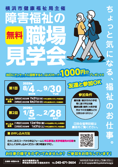 | オフィスウイング | 8月4日・5日・6日・7日・19日・20日・21日・22日 | ①10時~12時 ②14時~16時 | 「横浜駅」西口徒歩約10分 | 5人 | 就労継続支援B型 |