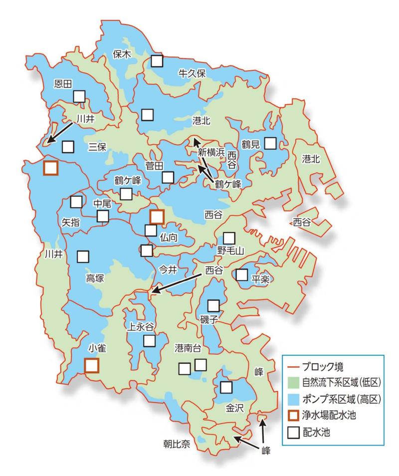 横浜市は、市域全体が起伏の多い丘陵地帯であると同時に、埋立地など標高の低い地域も多いことから、一定の圧力で市内全域に水を送ることは困難です。