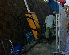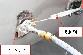 (1)マグネット付の固定具を用いて、漏水を排水しながら、補修材を仮固定
