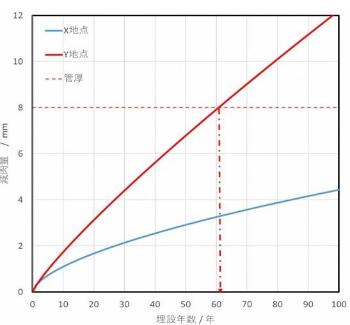 埋設管と同材質の金属体を埋設管近傍に設置し、電気的信号により連続的に減肉量を測定する装置(CTS)です。測定された減肉量から埋設管の減肉量推定曲線を算出し、埋設管の余寿命評価を行います。図ではX地点は100年以上問題ないと判断される一方、Y地点では60年程度で管厚まで腐食が到達する可能性があることを示しています。さらに得られた解析結果は、ミクロマネジメントとして、管路の更新時期を決定する一助となります。