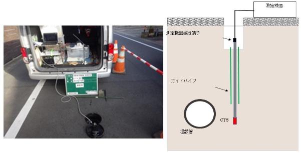 地中に埋設されて既設管(外管)の内側に新たに内挿管(内管)を挿入し、外管と内管の間にセメントグラウトを注入し両者を固定する方法がパイプインパイプ(Pipe in Pipe)工法です。グラウト材の注入が均質でない場合には機能を発揮できない恐れがあります。正常な場合は内管と外管が接触していないが不均質な場合は接触しています。内管と外管の間に矩形波電流を流し、その応答から接触の有無を判定する方法です。