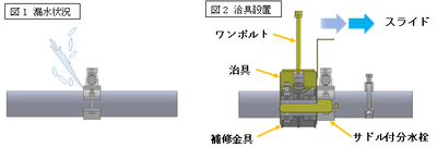 本工法は、漏水が発生したサドル付分水栓を断水せずに補修する工法です。