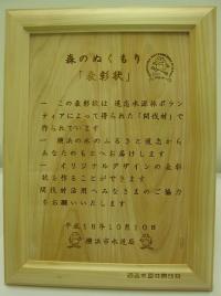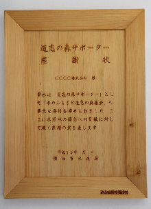 道志の森サポーター制度に登録する協定書を締結した場合は、水道局のウェブサイトや山梨県道志村の「道の駅どうし」に設置された案内板、横浜市の公共施設に配架する寄附募集リーフレットなどに企業名や団体名を掲載して、道志水源林の環境保全に貢献されていることをPRさせていただきます。また、新規登録の場合には、道志水源林の間伐材(檜材)で作成した「感謝状」を贈呈いたします。