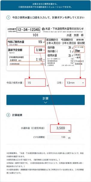 メーターの口径と使った水の量で「水道料金簡易計算ツール※」を使って水道料金が分かります。