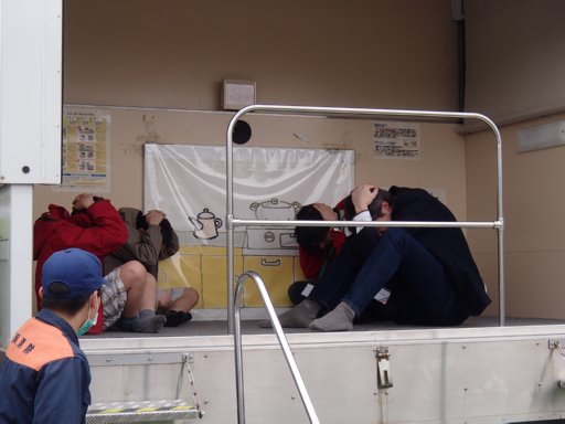 The explanations and hands-on training were provided by the Yokohama Naka Ward Fire Department’s staff and translated to French by volunteer interpreters. In the first part, we experienced earthquakes in a simulation truck.