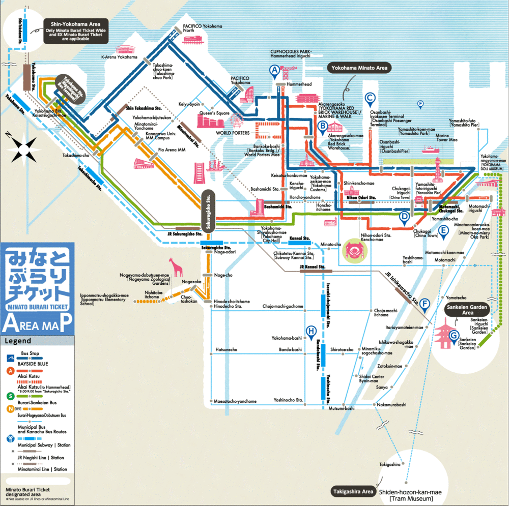 *With the Minato Burari Ticket Wide, you can also get on or off at the Municipal Subway Shin-yokohama Sta.