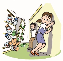 - 陳列棚の転倒や商品の落下に注意し、柱や壁際に身を寄せる