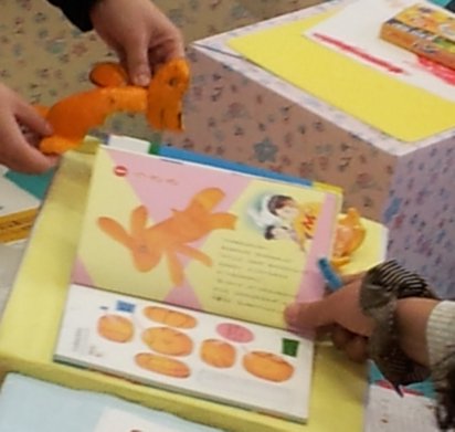Le jours où j’ai assisté à la classe, il était question d’alimentation. Après quelques chansons et livres d’images dont le but était de pratiquer les chiffres et les salutations , il y a eu trois ateliers : un atelier sur le japonais (Japanese Corner), un atelier d’information (Information Corner) et un atelier pour les enfants (Kids Corner). Les activités reposent sur la répétition ainsi que sur les gestes et les mouvements du corps, ce qui parfait à la fois pour la mémoire des parents et pour le plaisir des tout petits.