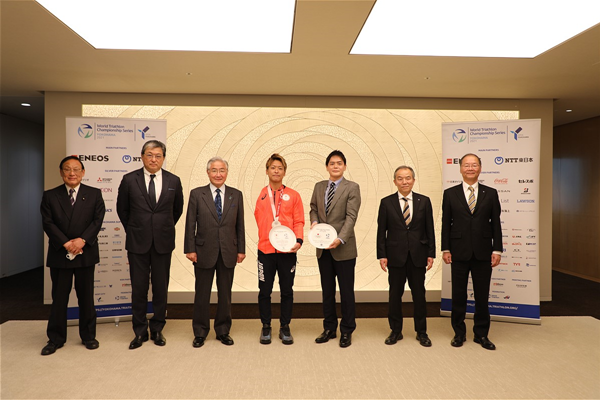 - このたび、日本トライアスロン連合の岩城光英会長とトライアスロン競技の宇田秀生選手が来訪されました。横浜市は、これまで10年以上にわたり世界最高峰のトライアスロン国際大会を継続して開催しています。今年開催された東京2020パラリンピック競技大会では、横浜での国際大会で御活躍された宇田選手が銀メダルを獲得され、同競技における日本人初のメダル獲得となりました。宇田選手の今後ますますの御活躍を期待するとともに、引き続き、国際大会の開催を通じて同競技と横浜を盛り上げてまいります。