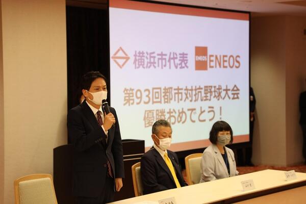 「第93回都市対抗野球大会(公益財団法人日本野球連盟・毎日新聞社主催)」に横浜市代表として出場し、9年ぶり歴代最多となる12回目の優勝を果たしたENEOS野球部の優勝報告会に出席しました。