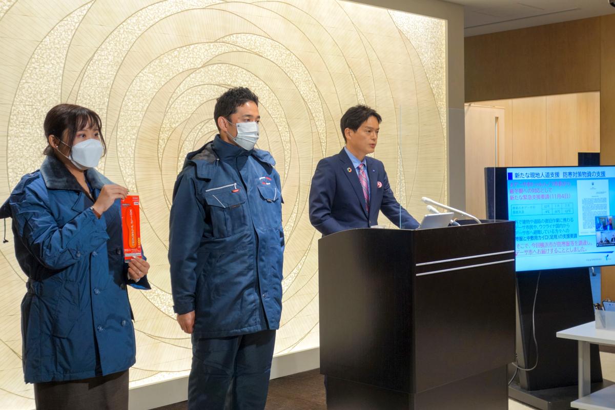 12月中旬には防寒服(上下)1900セットと靴用の中敷きカイロ1万足分、消防局の備蓄品の防寒服の上着80着をお届けする予定です。