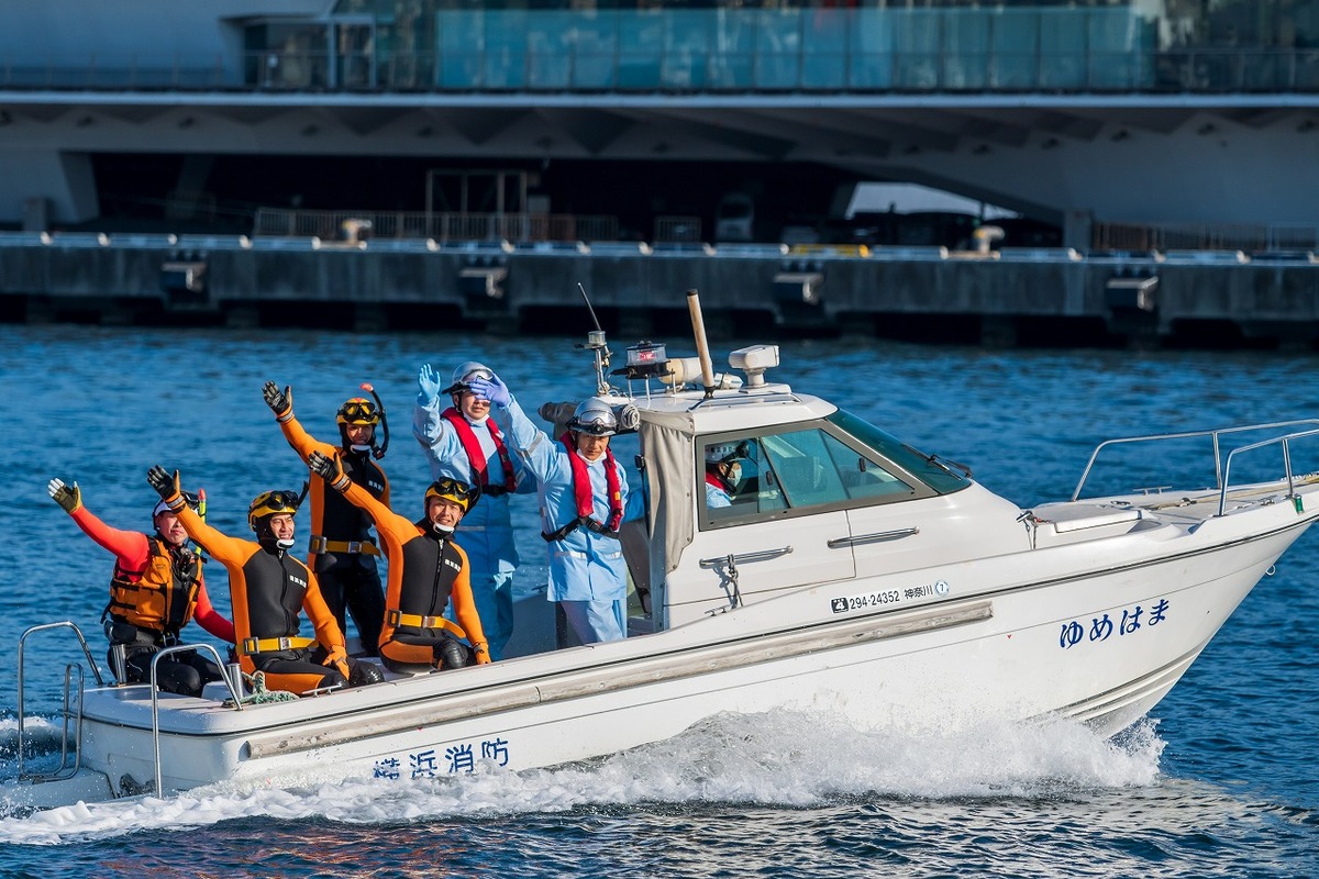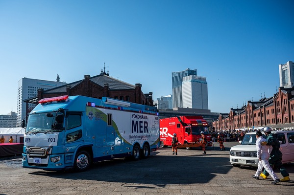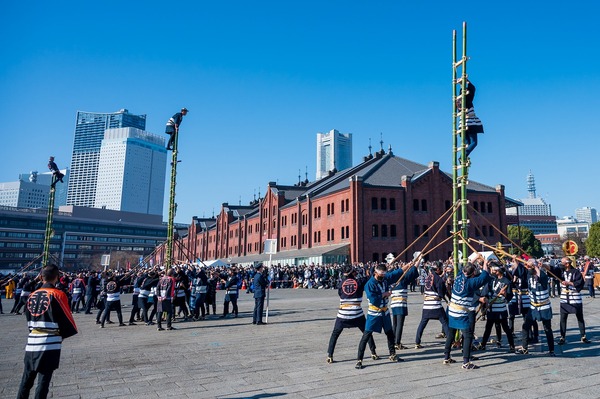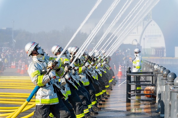 みなとみらいの景観が美しい赤レンガ倉庫での開催は3年ぶりとなりましたが、75,000人もの方が来場され、横浜古式消防保存会の皆さまによる伝統的な演技や、特別高度救助部隊と救急隊による総合訓練、迫力あふれる「一斉放水」をご覧いただきました。