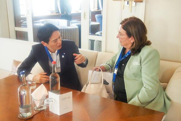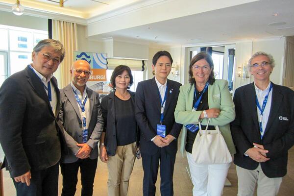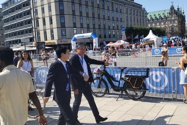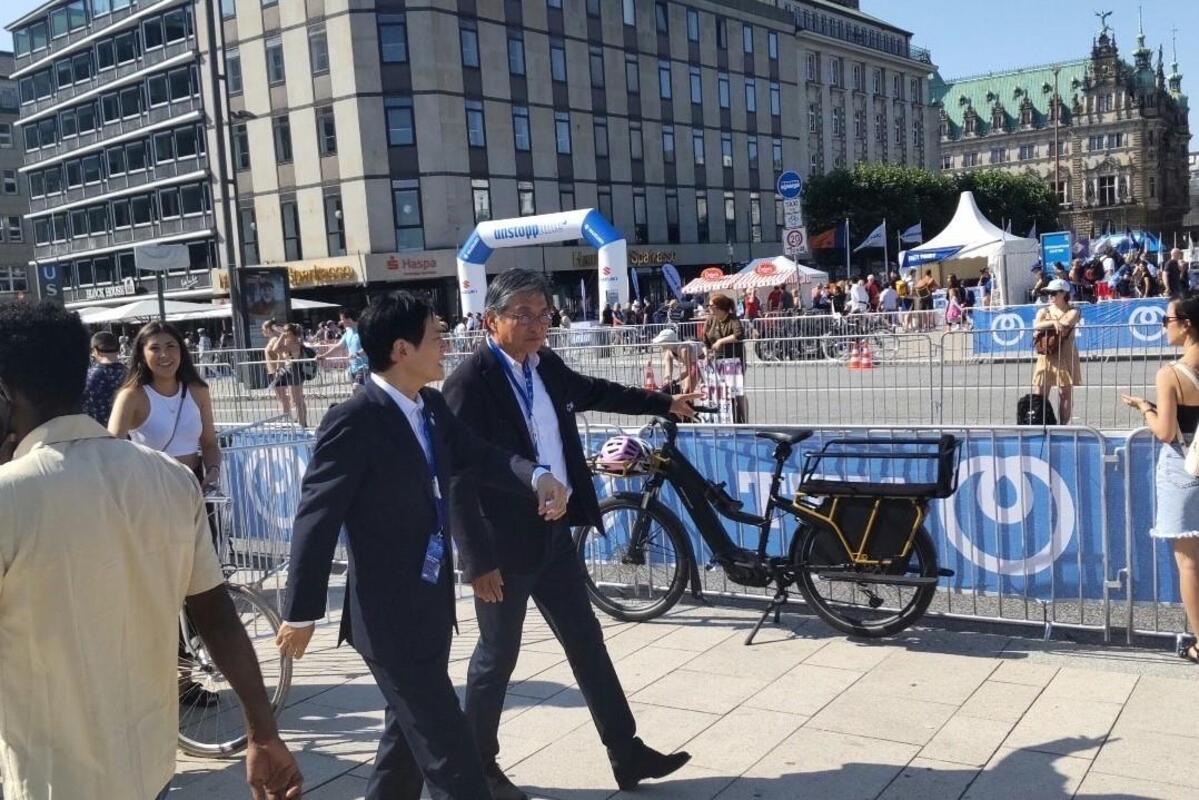 大規模な大会を円滑に運営する様子や、会場内の物販やイベントスペースなどによるにぎわいづくりの取組を実際に見させていただき、女性初の国際トライアスロン連合会長であるカサド会長はじめ、大会関係者の皆さまと意見交換をしました。世界中から多くの参加者、観光客が集まり、ハンブルクの街中がトライアスロン一色になって盛り上がる様子を肌で感じました。