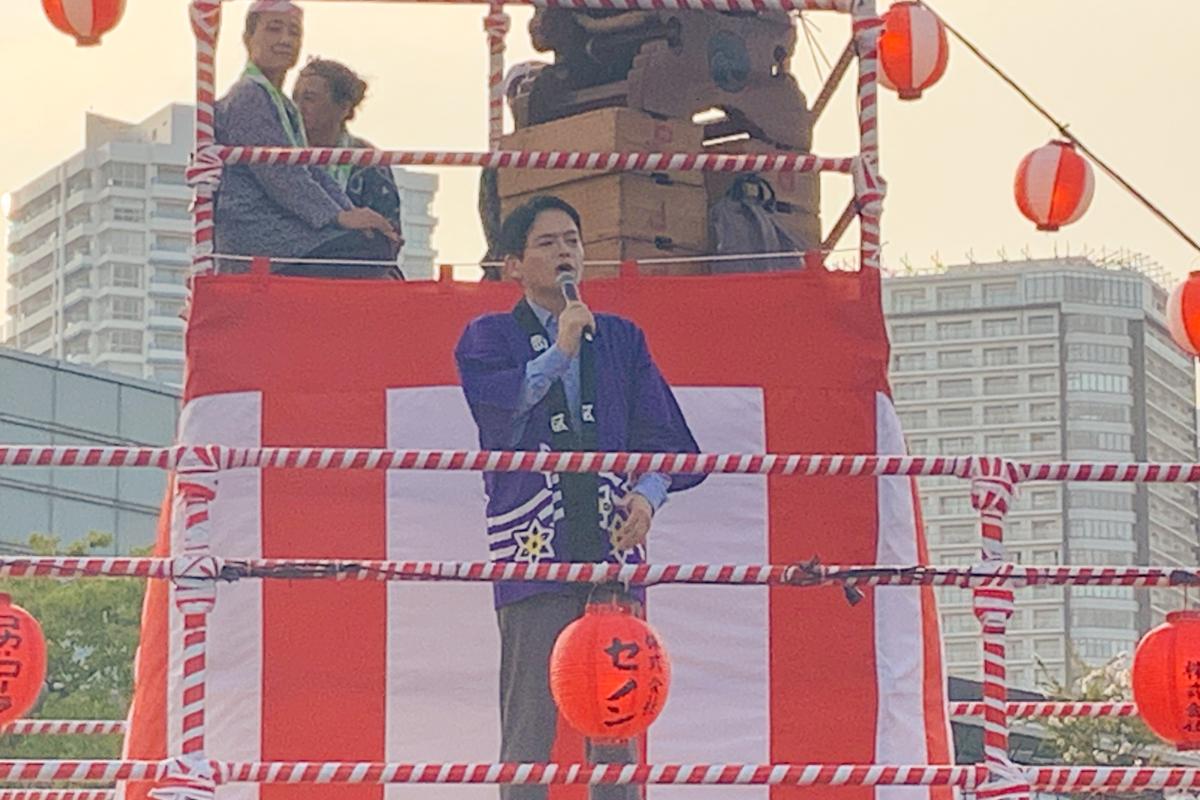 臨港パークで開催された「みなとみらい大盆踊り」を訪問し、やぐらの上からご挨拶をさせていただきました。