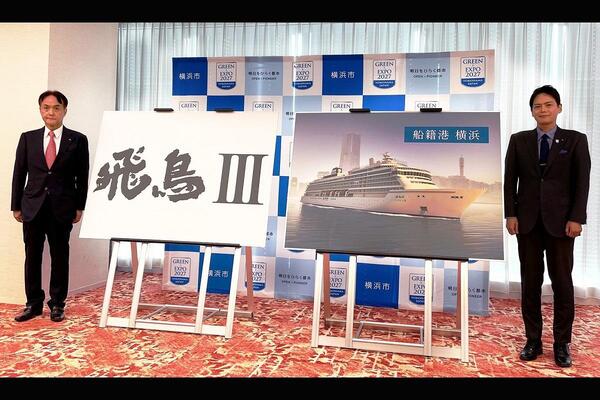 郵船クルーズ株式会社 遠藤弘之社長と共同で、新造クルーズ船の船名「飛鳥Ⅲ」と船籍港を「横浜」に決定したことを発表させていただきました。船体に「横浜」の文字が入れられた「飛鳥Ⅲ」が世界各国を航海する姿を想像すると胸が高鳴ります。