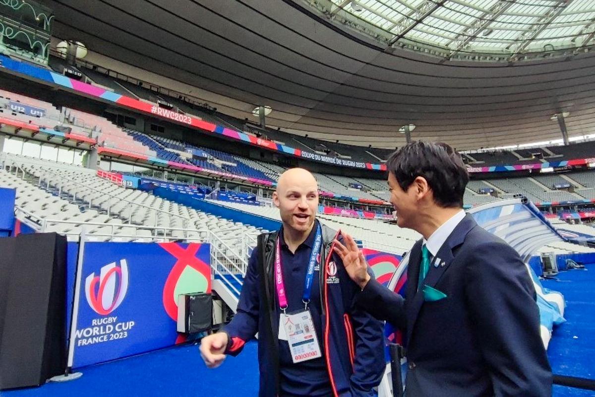 多目的スタジアム「スタッド・ド・フランス」を訪問し、ワールドラグビーのイベント運営統括責任者ロス・エイトケン氏と大会組織委員会の会場担当ブノワ・ラバリー氏から、ワールドラグビーが発表した「環境サステナビリティ計画2030(Environmental Sustainability Plan 2030)」に基づく環境に配慮した大会会場や運営のあり方について説明を受け、意見交換を行いました。