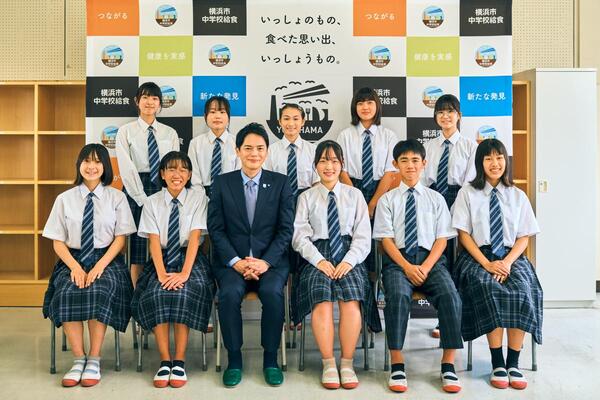 市立市場中学校を訪問し、昨年度の「中学校給食メニューコンクール」(※1)で市長賞を受賞した2年生(受賞時1年生)の塚本千夏さんやコンクールに応募していただいた生徒の皆さまと懇談会(※2)を行いました。
