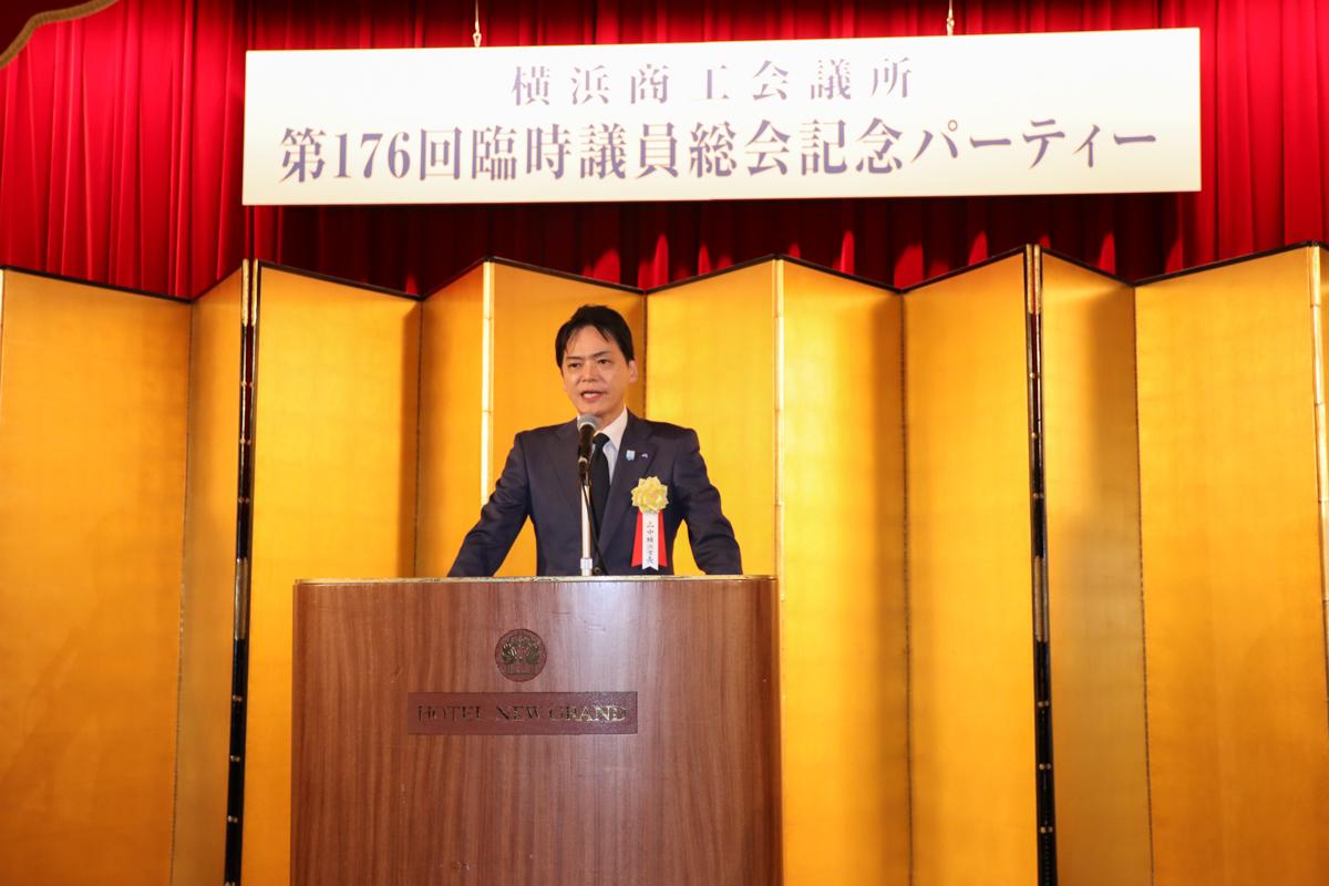 「第176回 臨時議員総会記念パーティー」に出席し、横浜商工会議所議員の3年間の任期満了に伴う新体制発足にあたり、お祝いのご挨拶をさせていただきました。