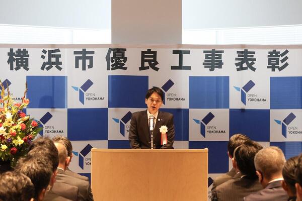 45回目となる「横浜市優良工事表彰」の表彰式で、横浜市の公共工事において高い技術力を発揮し、他の模範となる素晴らしい実績を残された施工会社・現場責任者の方々を表彰させていただきました。