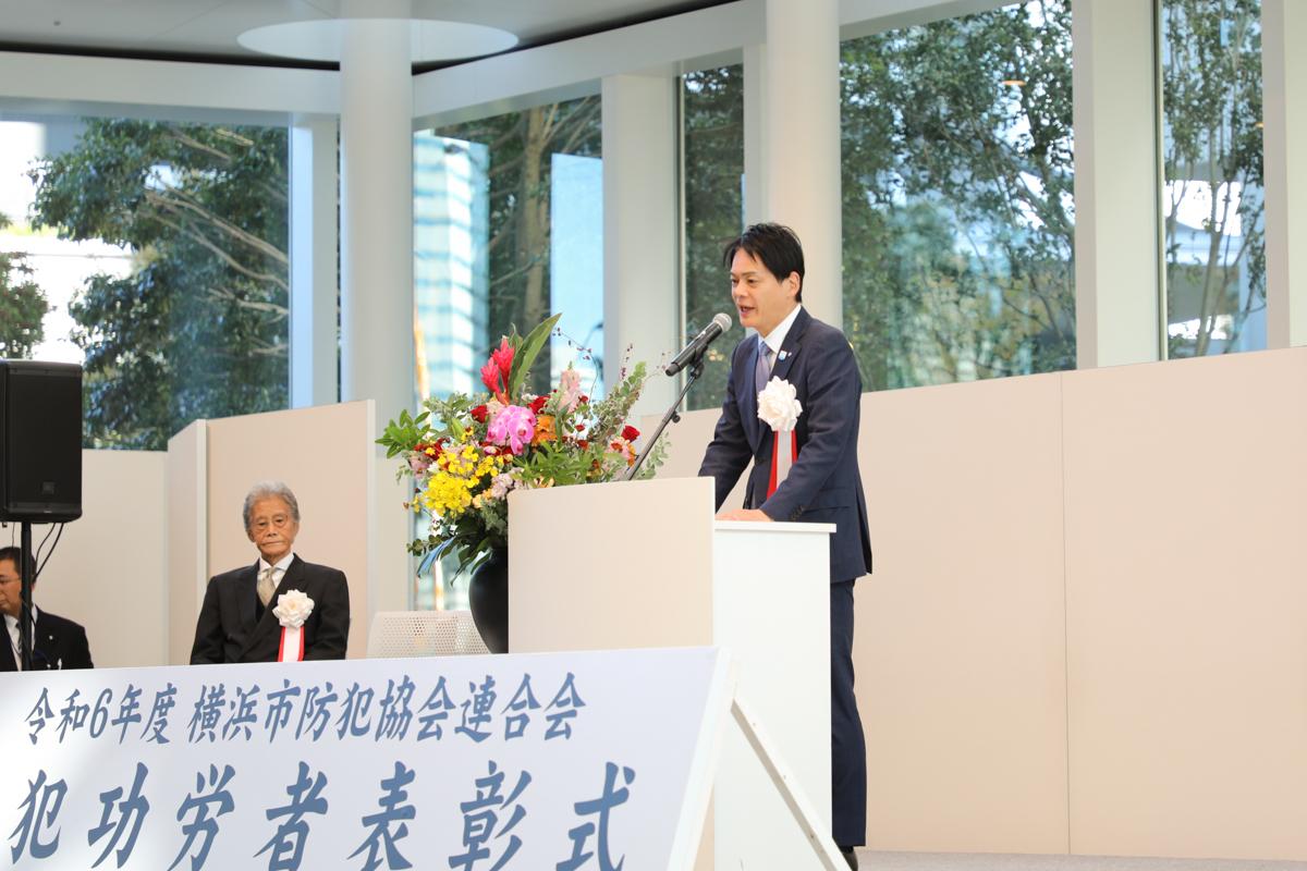 「横浜市防犯協会連合会 防犯功労者表彰式」で、長年にわたり防犯活動に多大なるご尽力をいただいている方々へ表彰状をお渡しし、感謝の言葉をお伝えしました。