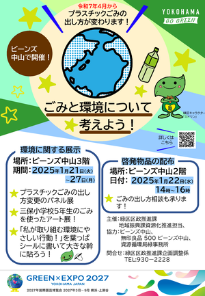 脱炭素やプラスチック関連の取組に関するパネル、無印良品のプラスチックのリユース・リサイクル活動のパネル(無印良品 500 ビーンズ中山)、三保小学校5年生によるごみを使ったアート作品などを展示します。