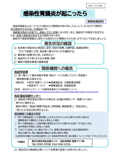 高齢者施設・障害者施設・保育施設等で感染症や食中毒を疑う事例が発生したときは、以下のとおり対応をお願いします。