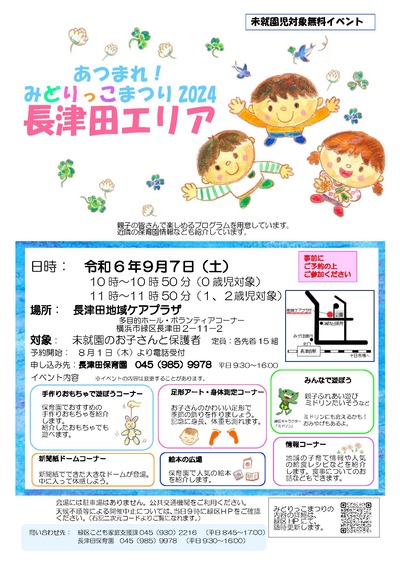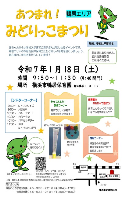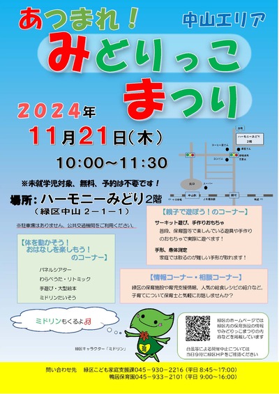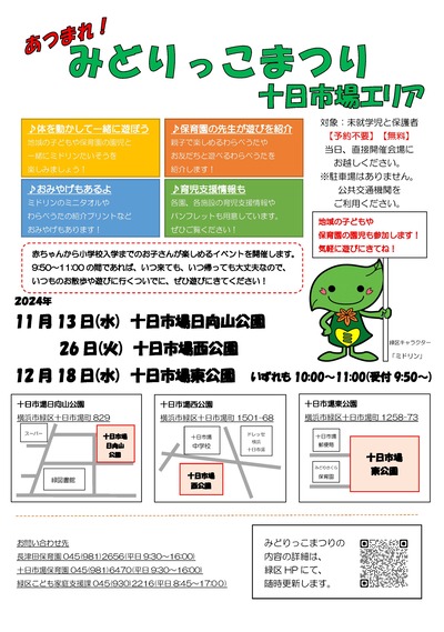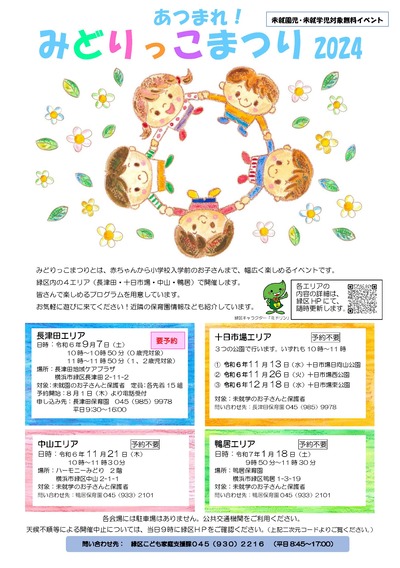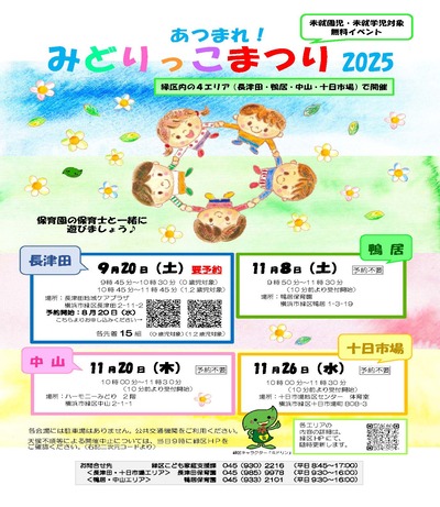 今年も赤ちゃんから小学校入学前のお子さんまで幅広く楽しめるイベントを緑区内の4エリア(長津田・十日市場・中山・鴨居)で開催します。