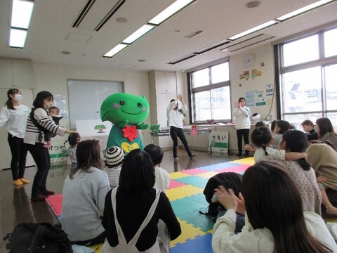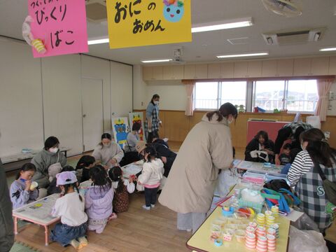 鬼のお面やびっくり箱の製作、保育園のおもちゃで遊ぶコーナーを体験いただいたり、パネルシアター、大型絵本、わらべうたで楽しく遊んでいただきました。ミドリンと一緒にクイズや体操をして喜ぶ様子など子どもたちの笑顔がたくさん見られたイベントとなりました。