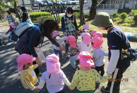 わらべうた”なべなべそこぬけ”では、2人組から人数を増やしていき、最後は参加保育園のお子さんと地域の親子とが一緒になり、30人程で手を繋いで行うことができました。