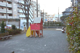 幹線道路沿いにあり、すべり台の付いた複合遊具がある小さい公園です。