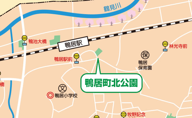 鴨居駅南口にある小さな公園ですが、買い物途中の親子連れなどが汽車の遊具でよく遊んでいます。商店の方も清掃をしてくださり、安心して遊べる公園づくりにご協力いただいています。