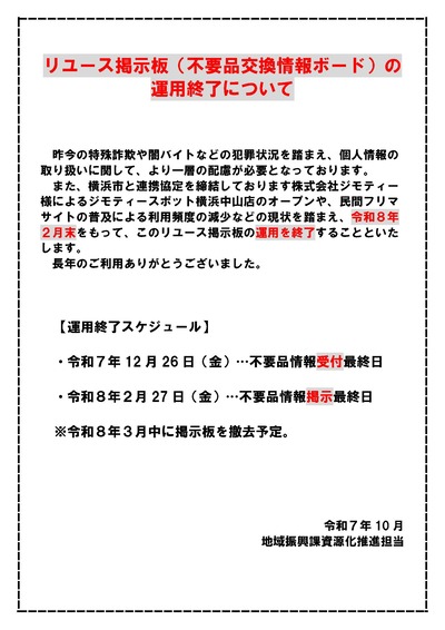 また、横浜市と連携協定を締結しております株式会社ジモティー様によるジモティースポット横浜中山店のオープンや、民間フリマサイトの普及による利用頻度の減少などの現状を踏まえ、令和8年2月末をもって、このリユース掲示板の運用を終了することといたします。