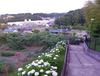 豊かな自然に囲まれる新治里山公園の奥津坂階段から見えるアジサイが盛りを迎えています。