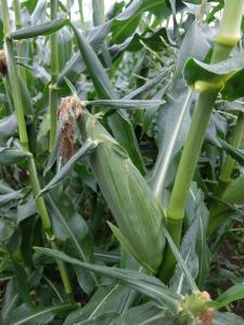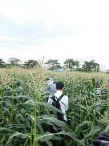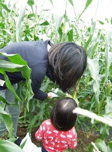 参加者は、背が高く伸びたトウモロコシの枝をかき分けて畑に入り、大きく膨らんだトウモロコシ約10本の収穫を楽しんでいました。