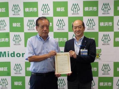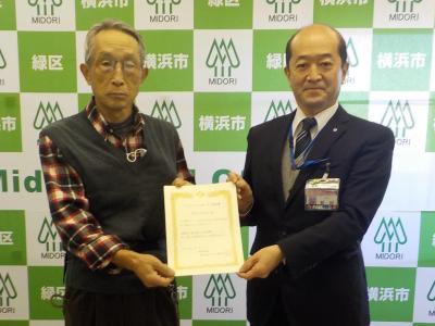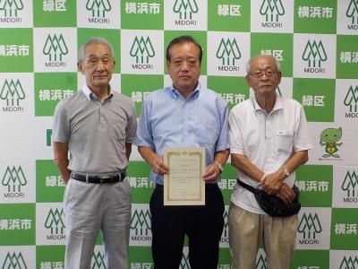 この記録達成に伴い、7月20日に、「市民防災の日」緑区推進委員会委員長の岡田区長から、竹山連合自治会の大谷会長へ感謝状を贈呈しました。