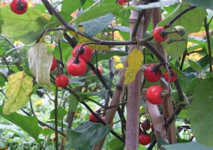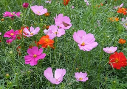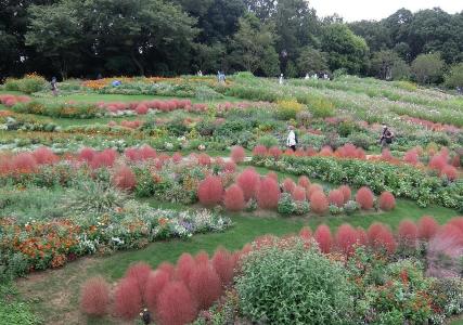 1ヘクタールを超える大花壇では、秋の花「コスモス」や「マリーゴールド」などが楽しめます。彩り豊かな花々の中に、ナスやトウガラシなどの実がなっている様子も見どころです。
