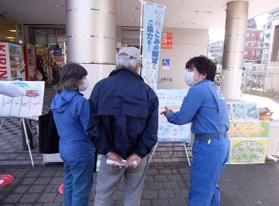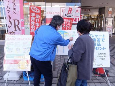 中山駅北口前のスーパーで、緑区役所と資源循環局緑事務所による地球温暖化対策のために身近な生活でできることを答える「環境アンケート」と「ごみの分別相談」が行われました。