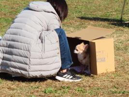 しつけ方の基本である「アイコンタクト」、「おすわり」、「散歩時の歩き方」「まって」「おいで」などの練習、発災時を想定した、段ボールをハウスに見立てて中に入る練習なども行われました。